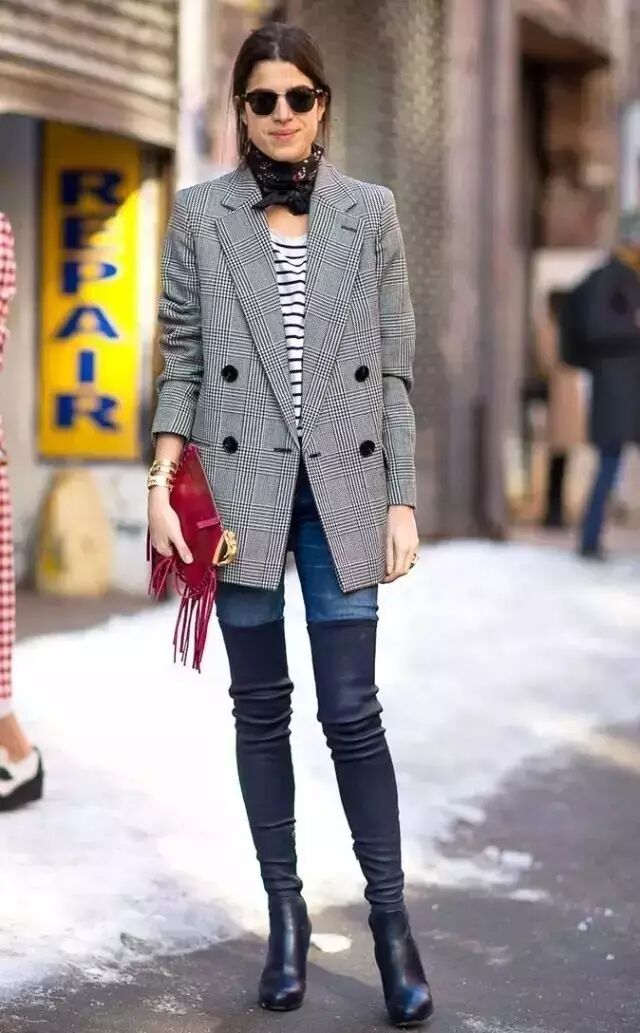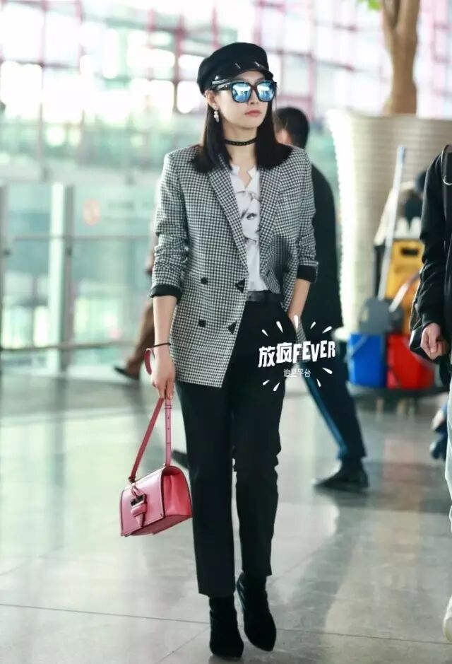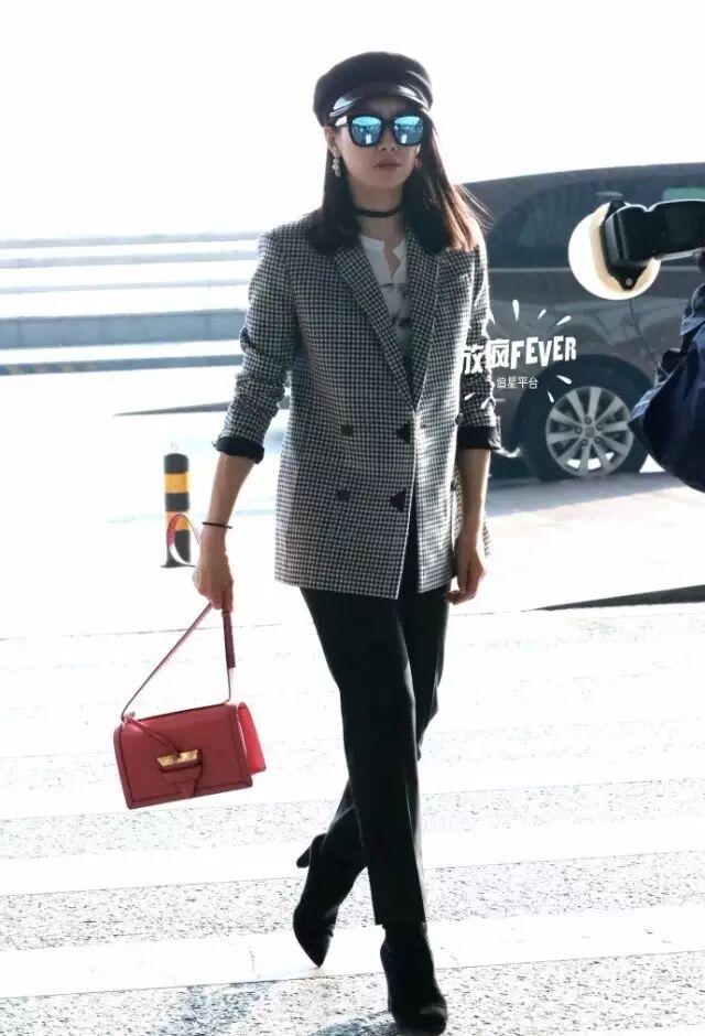 宋茜格纹西装外套搭配西服裤和丝绒短靴,手拿亮色的包包,摩登时髦。▼