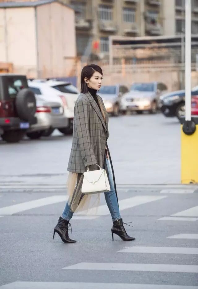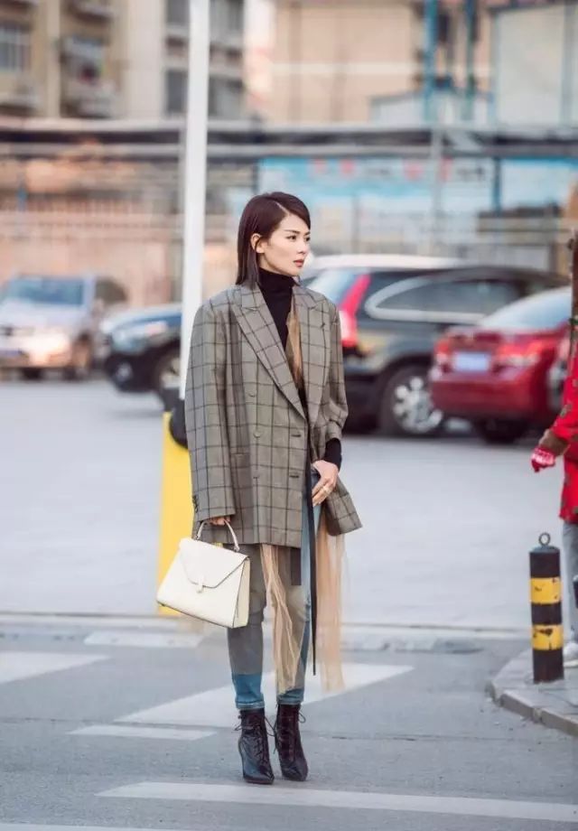 刘涛廓形西装外套搭配黑色高领毛衣和牛仔裤,简约又帅气的look,尖头高跟不但增加了女人味,也从视觉上拉长了腿部的比例。▼