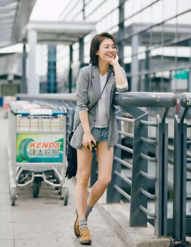 马思纯浅灰色西装外套搭配白Tee和牛仔裤短款,书呆子眼镜还有堆堆袜的搭配让整体造型虽然简约却很有值得推敲的地方,小清新森女风格。▼