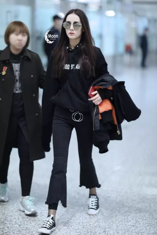 迪丽热巴黑色短款飞行员夹克 黑色卫衣 黑色磨边不规则牛仔裤,腰间圆环腰带特别抢镜。▼