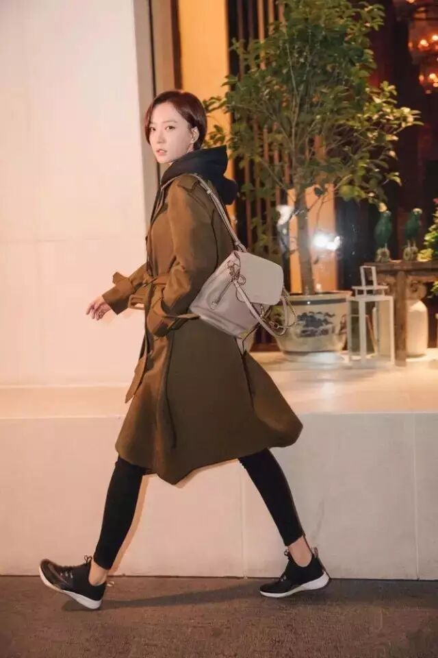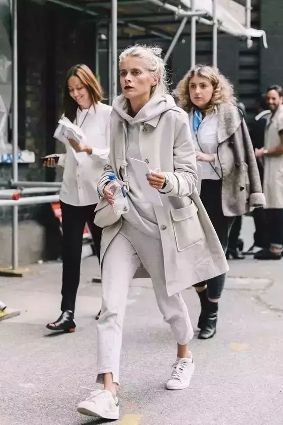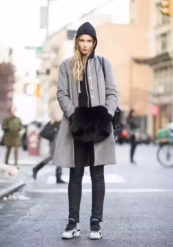 大衣和卫衣同色系的也是一个机智的搭配,非常的和谐顺眼~▼