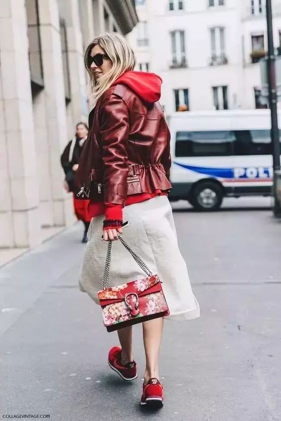 新年里酒红色机车夹克搭配红色卫衣不但好看也很应景~▼