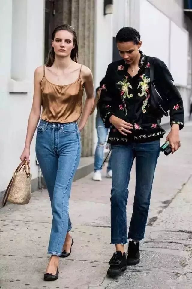 牛仔裤和吊带就是一副万能公式,吊带衫的性感和牛仔的中性组合在一起,娘man平衡,任谁都不会出错。