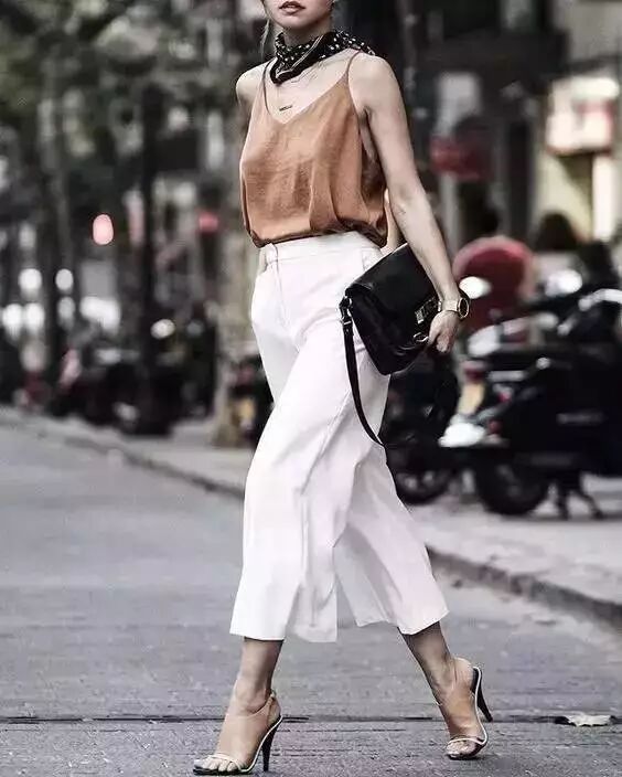 吊带是将你的阔腿裤造型过渡到夏天的绝佳选择,可以选择轻盈的面料和相对沉静的色彩。