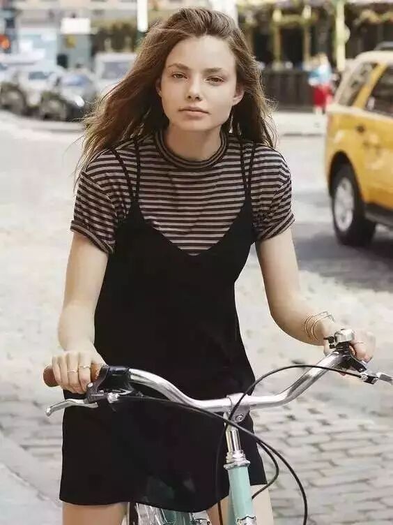 除了白Tee,简单的条纹T恤和黑色吊带也是完美组合。