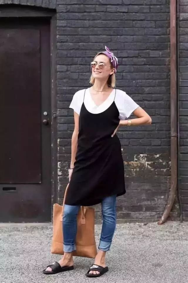 最简单的黑白配,一条黑色的吊带搭配白色T恤,轻松不出错。喜欢层次搭配的还可以选择短款吊带裙和牛仔裤叠加,看起来更加俏皮活泼。