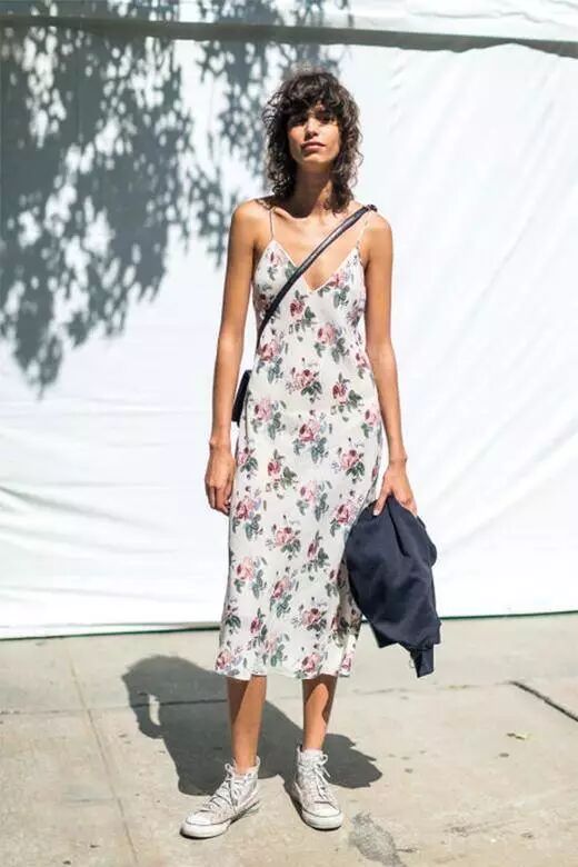 本身就足够浪漫的印花裙,结合吊带的一些小性感,造型更加轻薄飘逸,轻易打造浪漫甜美的仙女气质,搭配球鞋也丝毫没有违和感。