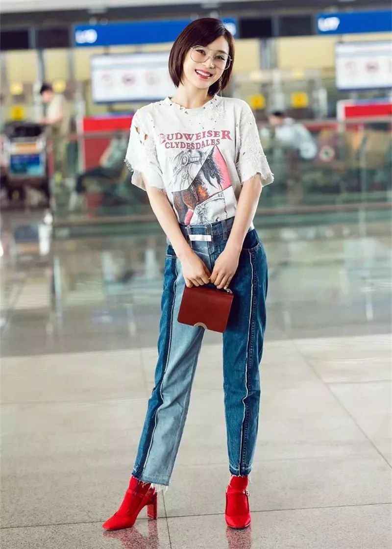 宋佳的Two Tone Jeans深浅交替更显瘦;唐艺昕添加了刺绣元素在其中,显得个性十足。