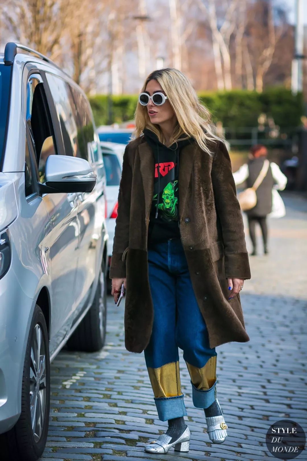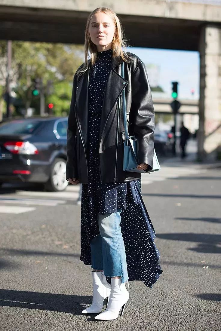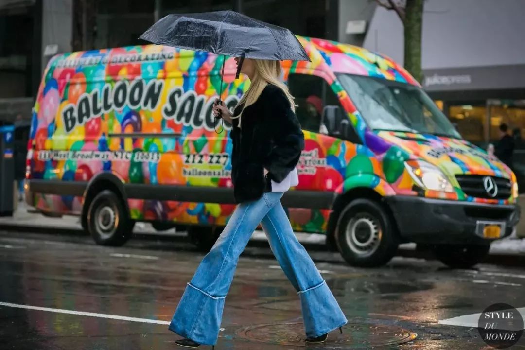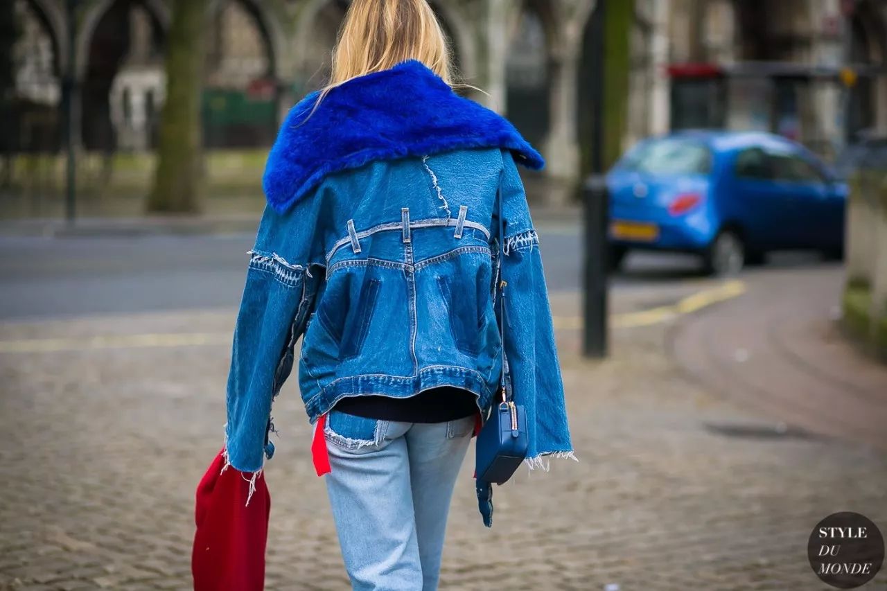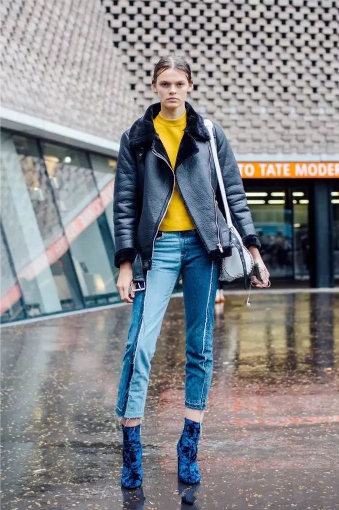 拼色牛仔裤的好穿之处在于它能特别恰到好处的中和掉你身上所有“over”的感觉,就比如和皮草搭配也不会觉得夸张,相反皮草都多了几分休闲。