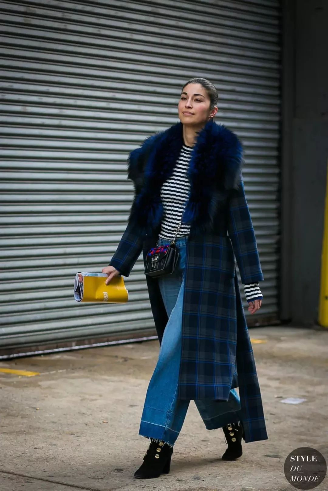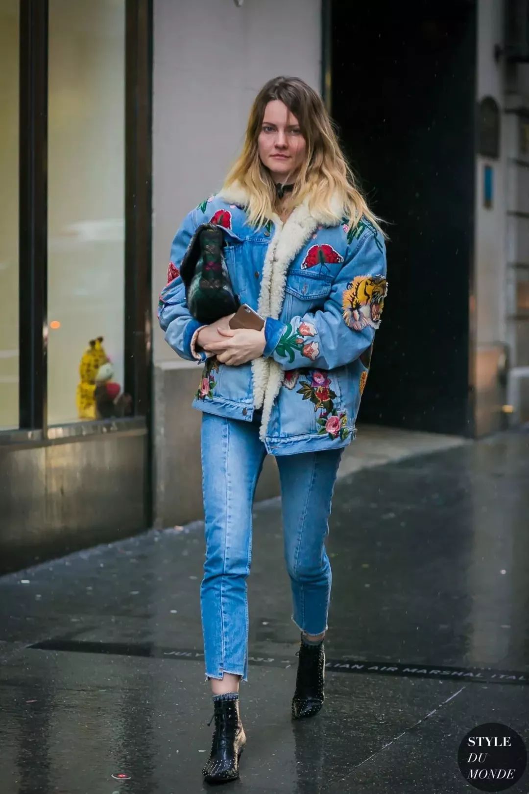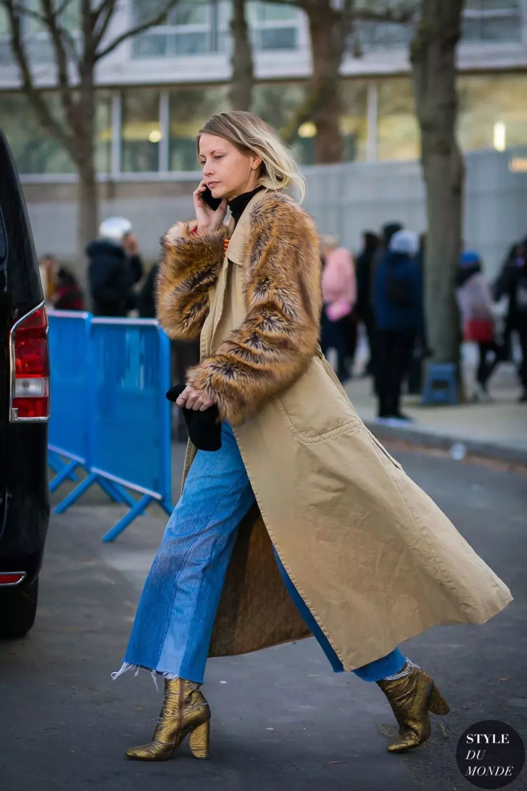 拼色牛仔裤的好穿之处在于它能特别恰到好处的中和掉你身上所有“over”的感觉,就比如和皮草搭配也不会觉得夸张,相反皮草都多了几分休闲。