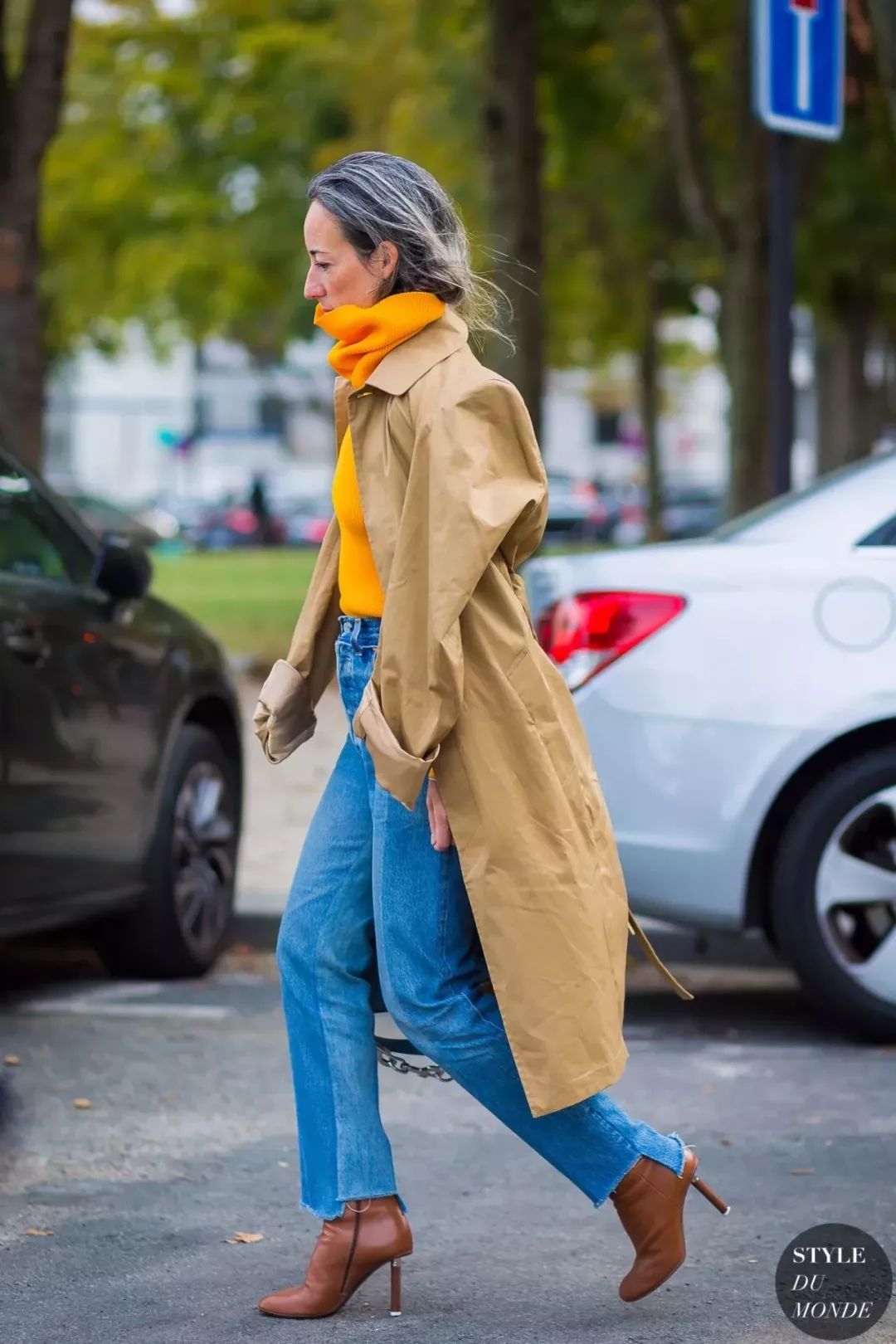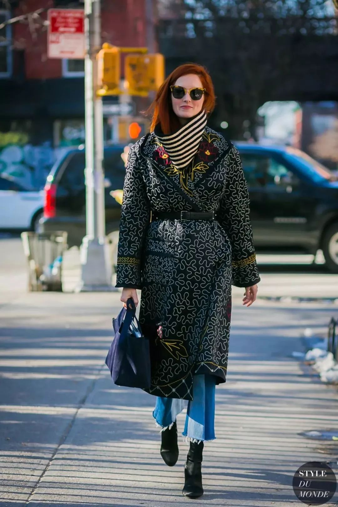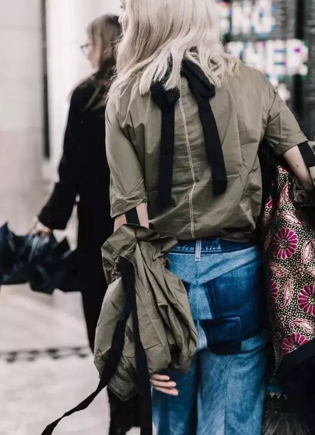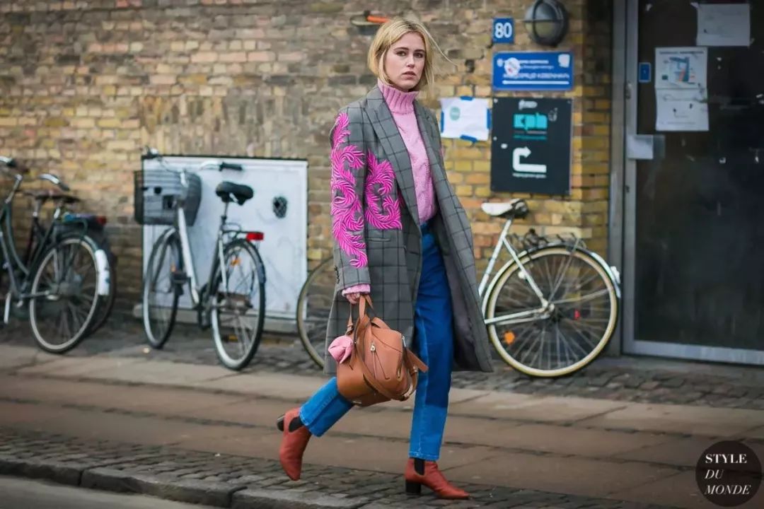 除了经典的单色大衣,牛仔裤的简单利落还很适合和一些印花撞色做减法。