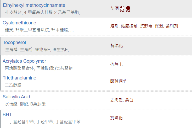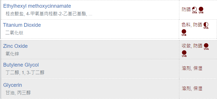 主要成分都体现在防晒和保湿效果上了,其他成分都是乳化剂,溶剂,柔顺剂一类的。也没有任何一项隔离紫外线隔离脏空气隔离彩妆的效果。