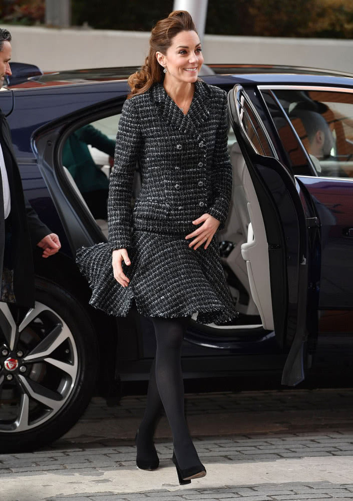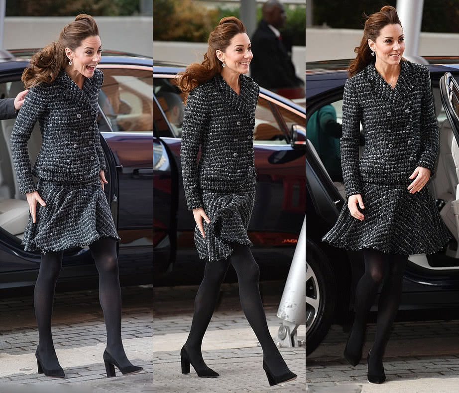 英王室穿黑色裤袜倒是比较罕见,英王室似乎就有一项穿裙子必须光腿的规定,可以更好地展现出女性的魅力。英女王伊丽莎白二世就是很好的例子,无论什么季节,只要穿裙子都是光腿出行。但是凯特王妃选择了更加凸显女性成熟韵味的黑色丝袜。优雅气质的短裙装造型,搭配高跟鞋是必须的了。凯特王妃搭配了一双黑色高跟鞋,跟整体的黑色风格搭配一致。既凸显了气质,同时又增加了身高,而且黑色也是十分沉稳大气,满满的女王气场。