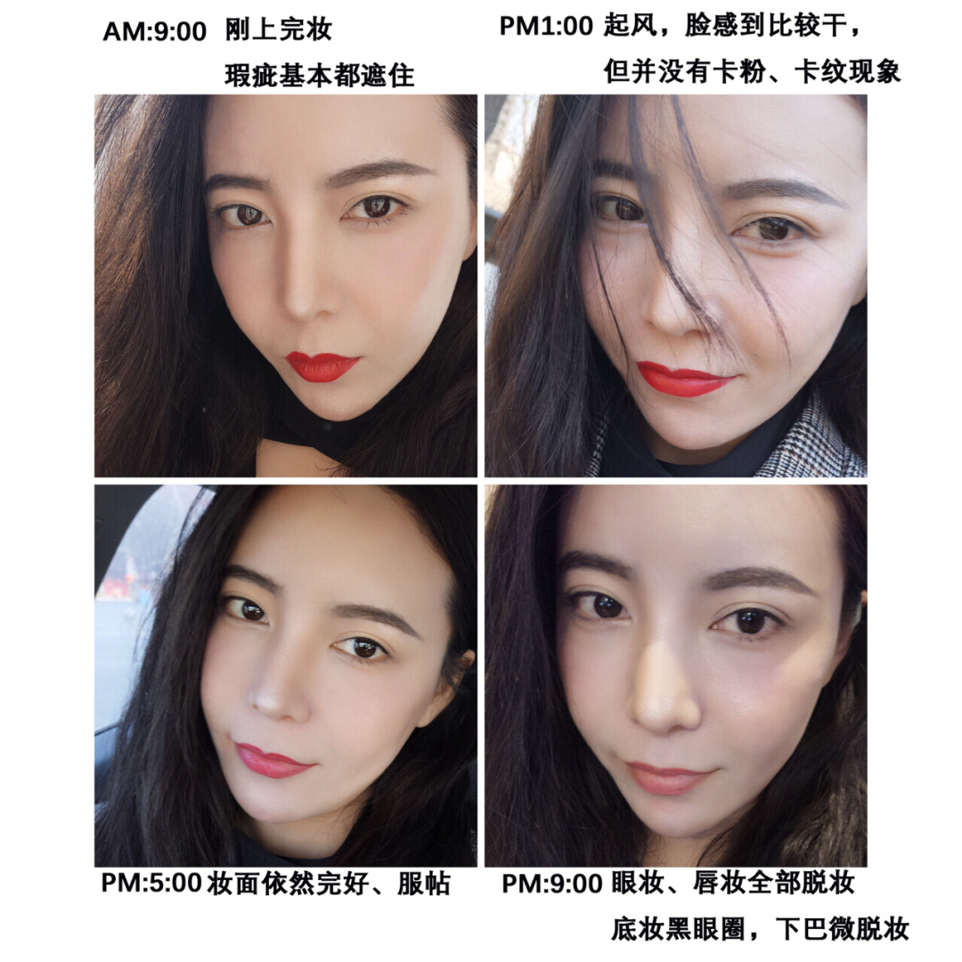 滴管设计用起来非常方便,也很卫生。这款粉底主打水润效果,推开之后真的就和水一样,不会油腻。上脸之后很自然,即使多涂几层也不会有厚重感。持久度中等偏上,适合干皮和混合皮,偏哑光的奶油肌妆感。