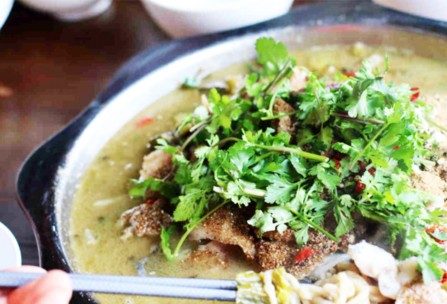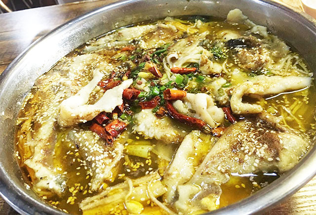最吸引人的还是用盆装的酸菜鱼面。一大盆上来的架势真是不一般,鱼片很厚很大片,滑嫩Q弹,配菜丰富,面条是手擀面。