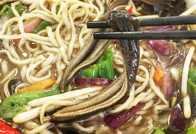 一闹操长鱼面曾经在淮安金牌旅游小吃(面条类)的比赛中摘得桂冠,配料用了长鱼、洋葱、青红椒、蒜黄等多种食材,汤料是精心熬制的鸡汤加原骨汤。