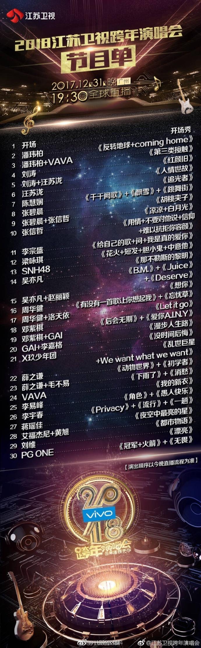 "江苏卫视明星阵容:赵丽颖(嘉宾主持)、李宇春、吴亦凡、李易峰、梁咏琪、江疏影、毛不易、pgone、李宗盛、周华健、陈慧娴、张信哲、潘玮柏、汪苏泷、薛之谦等。跨年节目播出时间:12月31日晚19:30播出