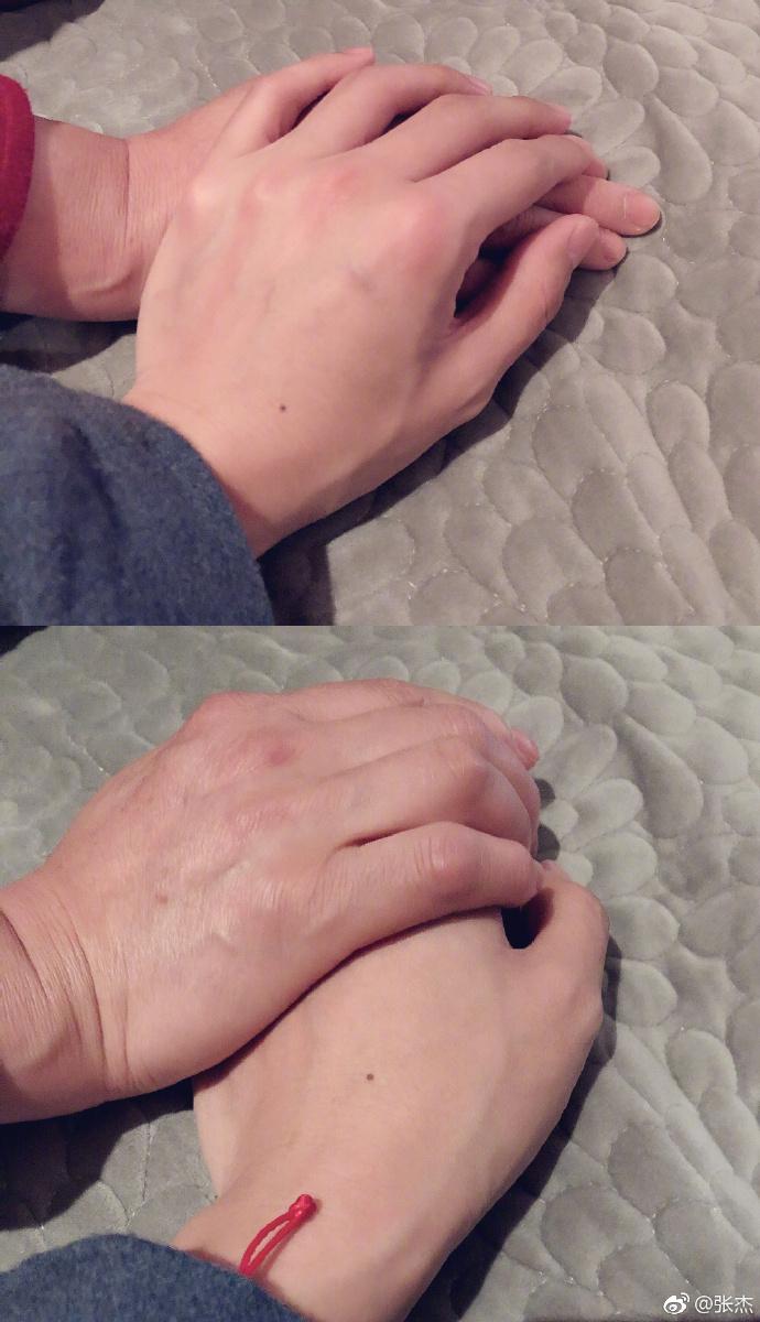 照片中,是张杰和她妈妈握在一起的手,张杰还动情的说道:“你养我长大,我陪你变老……”!