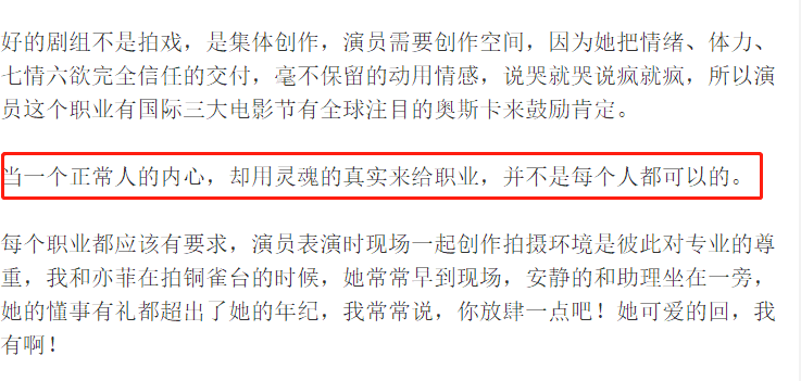 伊能静的“才女”之名早就人尽皆知,她喜欢在微博上抒发自己的感慨。昨天,伊能静就发长文力挺刘亦菲,称两人合作《铜雀台》时,刘亦菲常常早到现场,安静的和助理坐在一旁,很懂事有礼,“她是太好的孩子,请与她相遇的每一个人多多珍惜。”