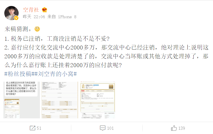 总结:杨幂的嘉行公司实则应付杨幂文化交流中心2000多万,那交流中心已经注销,理论上说明这2000多万的应收款是处理清楚了的,交流中心当坏账或其他方式处理掉了,工商上面实则没有注销,那么为什么嘉行账上还挂着2000万的应付款呢?嘉行把2000多万应付账款挂在一个已注销的空壳公司上面?