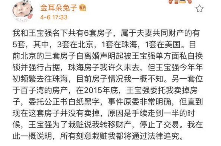 6日傍晚,马蓉在微博上宣示主权,称与王宝强共同拥有5套属于夫妻财产的不动产,北京5套,珠海1套,以及美国还有1套,但是自离婚后王宝强却私底下将北京的3套房子换成了私锁,强行霸占。