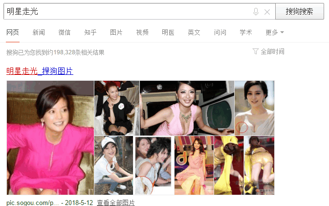如果你在搜索框内搜索“明星走光”四个字,会搜到大量狗仔抓拍或者明星不小心漏点的照片。