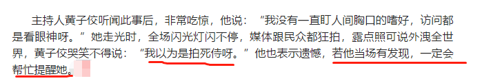 但事后她本人称那时完全不知自己已经走光,主持人黄子佼也表示当时没注意到,要是发现了,肯定会提醒的。