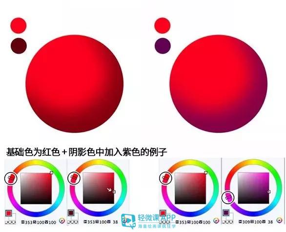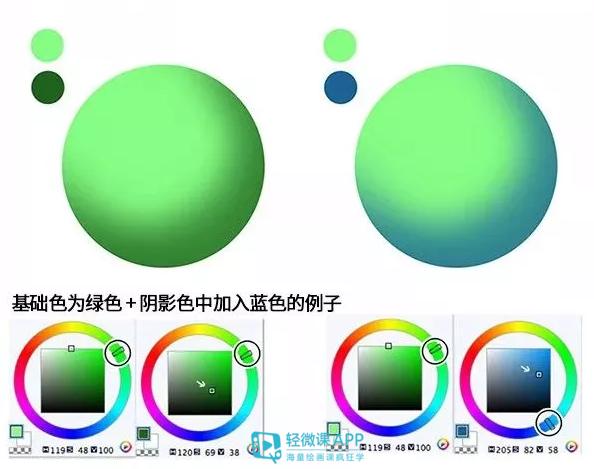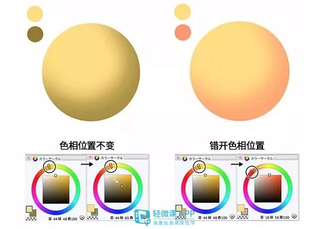 左边的球体没有改变色相,只改变明度和饱和度。右边的球体错开色相,对明度和饱和度也进行了调整。通过对比就能看出,错开色相和饱和度的,就能画出不阴沉的阴影色。