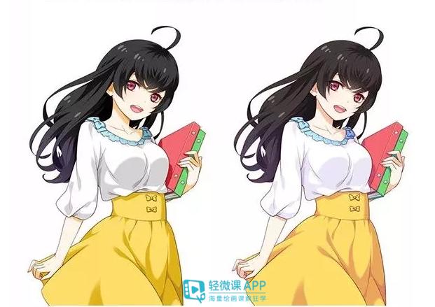 请注意对比这两个角色。哪一个看起来更像当下流行的清新插画风格呢? 当下流行的美少女插画风的要点是颜色的选择要干净。左边的角色看起来虽然也不差,但右边的角色看起来整体呈现轻快的日系插画风格。