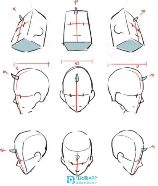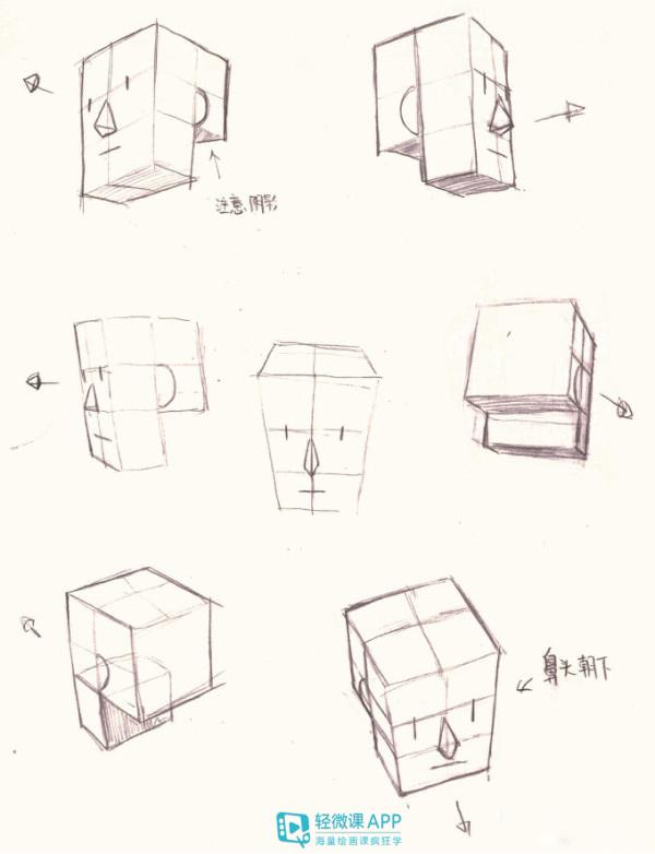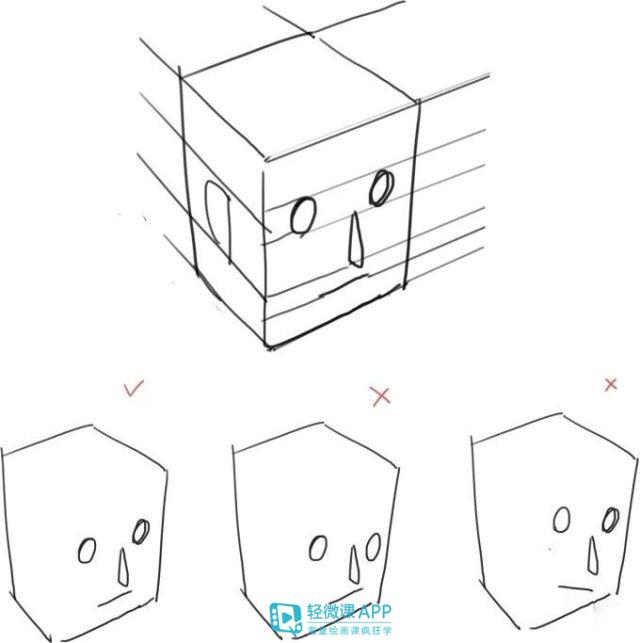 注意不光是头部方块的轮廓,五官的透视也是根据方块的透视线走的