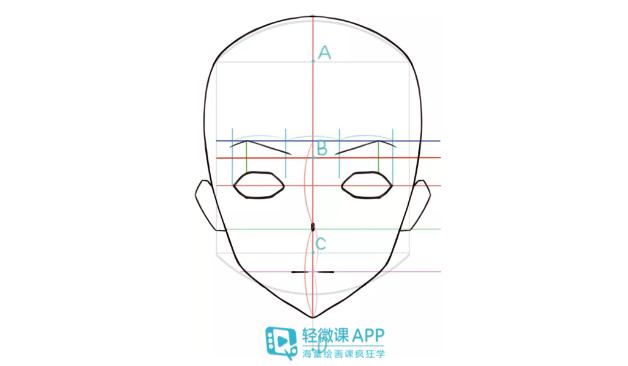 3、根据前部位置绘制部件,从眉毛到下巴之间划一条线