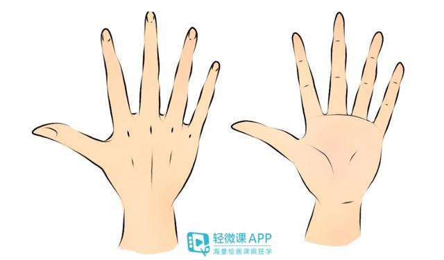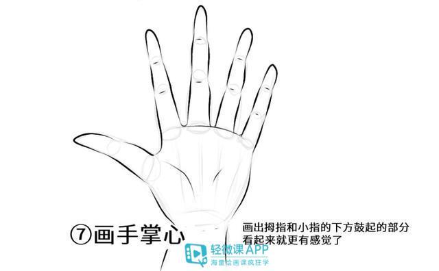 画手掌心——画出拇指和小指的下方鼓起的部分和一些纹路即可。