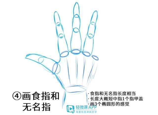 画食指和无名指——食指和无名指长度相当,长度大概短中指1个指甲盖的距离,画三个椭圆形。