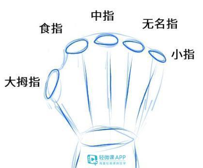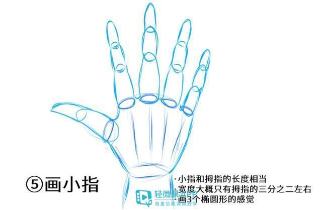 画小指——小指和拇指的长度相当,宽度大概只有拇指的三分之二左右,画三个椭圆形。