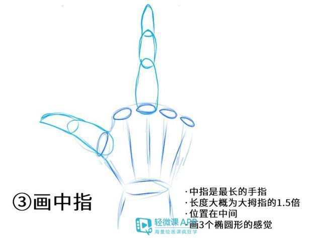 画中指——中指是最长的手指,长度大概为大拇指的1.5倍,位置在中间,画三个椭圆形。