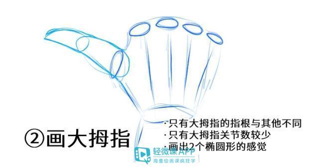 画大拇指——大拇指的指根与其他不同,因为大拇指关节数较少,可以直接画出两个椭圆形。
