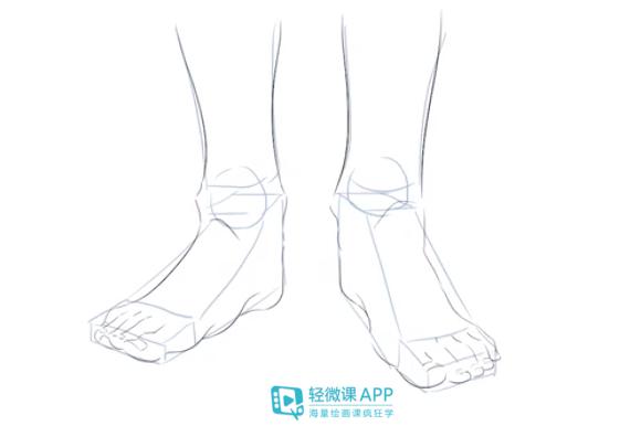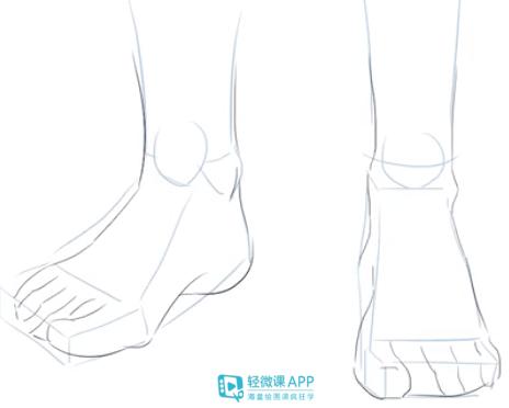在画脚的轮廓时,前脚掌与地平线式平齐的,使脚背形成倾斜,脚底呈现一种z字型转折。