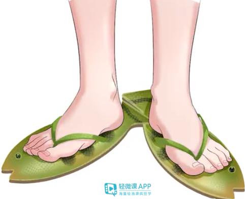 凉拖鞋因为脚基本都要露在外面,所以脚比较难画的部分也要画出来,先画出一双脚,把鞋底画成咸鱼的形状。