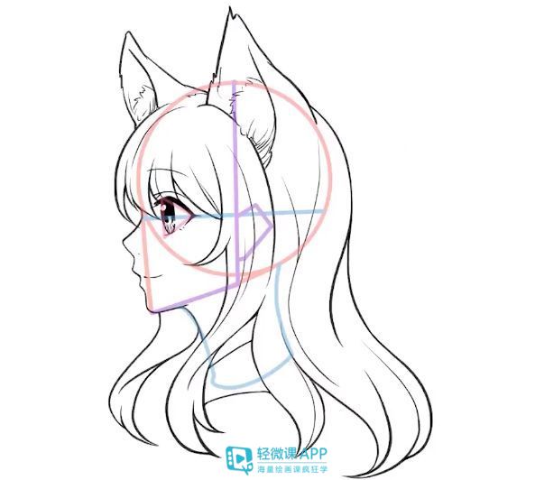 因为是侧面所以那一条竖线就是我们五官的朝向了,因为是正侧面所以可以在头部的中间画一条竖线用来确定下颌处还有耳朵的位置