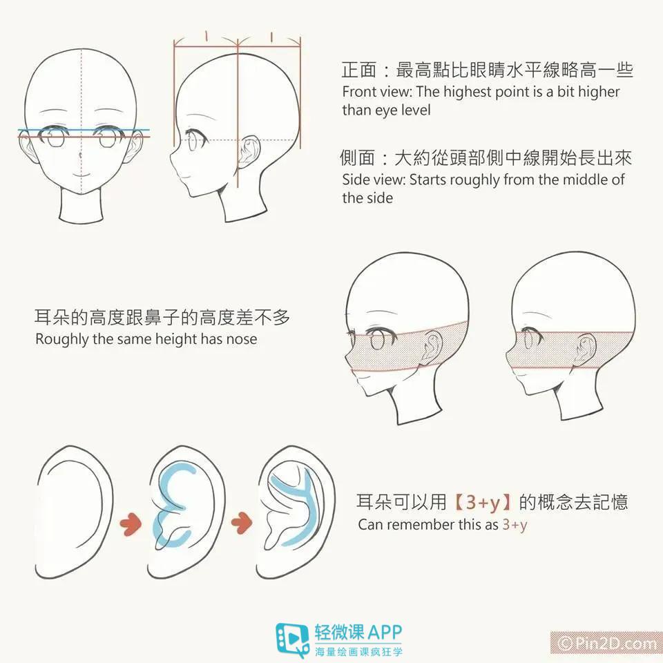 耳朵长在人脸的侧面,高度处在眉毛与鼻底中间,但并不是垂直生长的,而是有点倾斜。在画正面头像时,耳朵离人的视觉焦点比较远、比较虚。而画侧面时,耳朵则正处于人的视觉中心,所以结构会比较明显。
