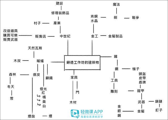 不论是哪一种企划,首先都要进行脑力激荡的发想和主题分析。为了要设计以中世纪形象为基础的奇幻世界锻造工作坊,会先调查锻造工作坊的功能并写下关键字,拓展灵感。