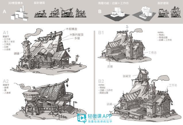 在这个步骤里还可以调整建筑物的形状和比例,所以这时会选择把精神集中于设计,解决配置上的问题。本教程利用了建模程式SketchUp制作简单的3D模组,以它作为基础的形状。在制作缩图前,写下几个关键字,确立好建筑物使用的建材和设计的方向。把A提案设定为具备基本功能的简单锻造工作坊,B提案则加上交易所,让工作坊额外具备贩售道具和武器的店铺功能。
