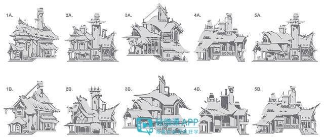 从刚才绘制的剪影中选出五个,一边留意主要构造和建筑物的各种要素,一边画上细节。虽然一开始先绘制从侧面看来的造型会让图像显得有些扁平,但这样做能在绘制建筑物的正面时激发更棒的点子。
