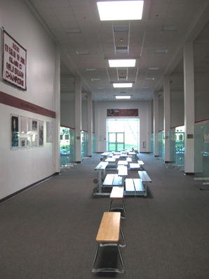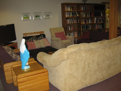 这就是我的宿舍的公共休息室。在周末或者放学后大家有的时候会坐在沙发上聊天,看电视。书架上的书可以随便借阅,有的时候还能发现中文的SAT辅导书。