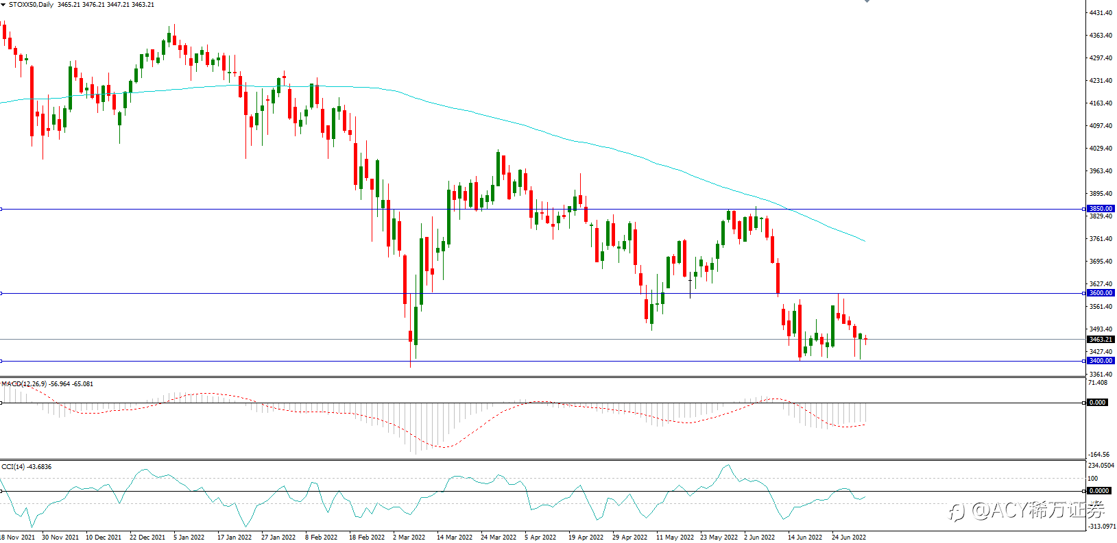若有突破,股价才有进一步上涨的动能,并持续挑战3850的压力位置,下方支撑位于3400,须注意股价可能在七月ECB的利率决议后有进一步的修正,跌破此支撑价位,下探2020年疫情低点的2700位置。