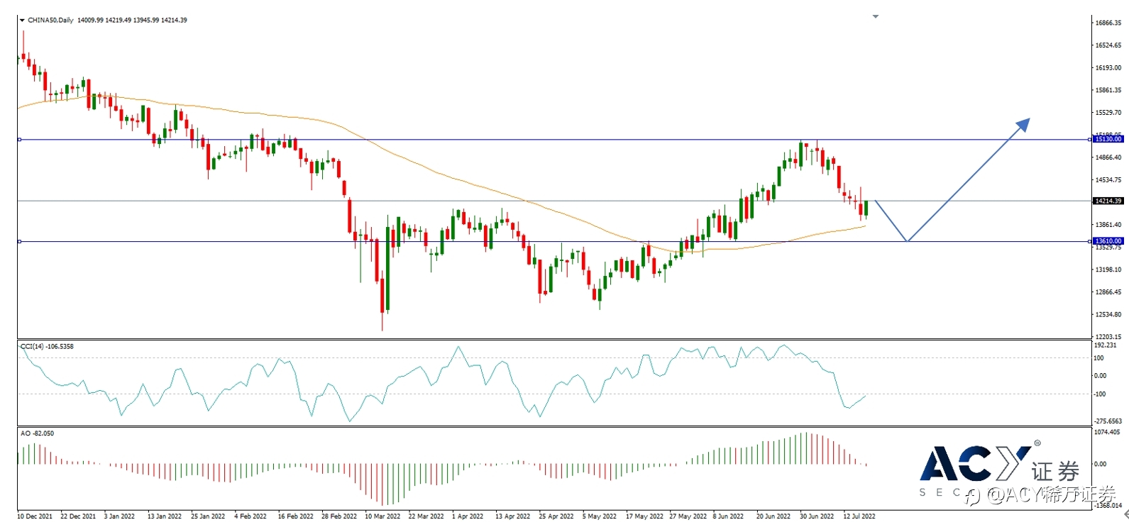 从中国50指数的每日图来看,近日价格回到60MA之上,目前价位在13,610到15,130之间震荡,并从七月以来价格有小幅修正,长线来说中国经济数据开始稳定增长,配合政府的宽松政策由货币端持续传导到企业和民间的需求,长期投资人可以考虑把握价格修正的机会分批入场;对于短线交易者来说,留意股价在碰到60MA时是否有所支撑,若能守住此价格不跌破,可配合CCI由下往上突破-100以及AO柱线突破零轴作为进场参考,上方压力位置在前次高点15,130,若能有所突破则持续挑战16,000的整数关口。