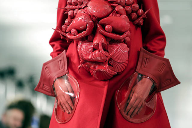 看似粗糙廉价的条纹丝袜、PVC 材料、与泡沫,让他组织出了破败贵族的奢华美感。