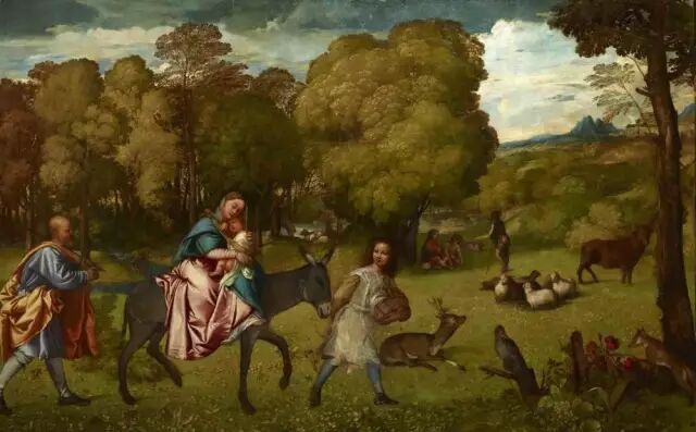 描绘这一题材的绘画有很多,提香的与众不同在于,他的画面中人物形象并不是那么大,似乎风景更为重要。