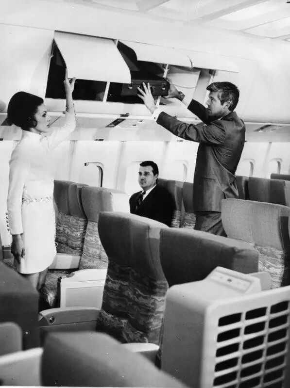 1968年,新型喷气式客机L-1011内部开始配有座位上方行李架。