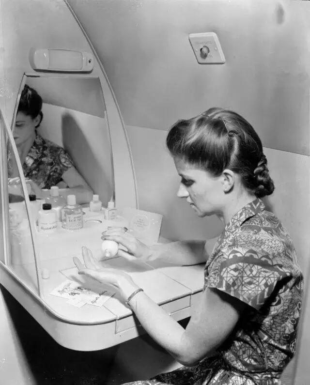 一个乘客正在世界上第一架喷气客机“彗星号”的女性化妆间梳妆。